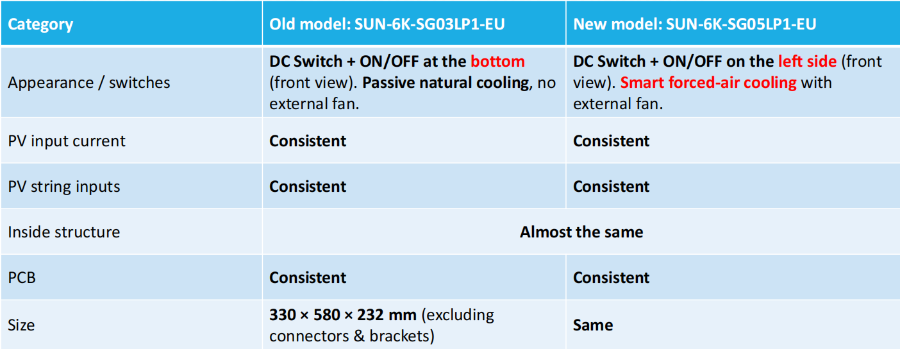 Overgangen fra den gamle modellen (SUN-6K-SG03LP1-EU) til den nye modellen (SUN-6K-SG05LP1-EU) gjenspeiler forbedringer i kjøling og brukergrensesnittdesign, med tillegg av tvungen luftkjøling og en mer tilgjengelig bryterlayout. Disse endringene forbedrer både ytelsen og brukervennligheten til omformeren. Installatører må imidlertid ta hensyn til den potensielle støypåvirkningen fra den nye eksterne viften og sørge for riktig klaring for effektiv luftstrøm. De elektriske kjernekomponentene og dimensjonene forblir stort sett uendret, noe som sikrer kontinuitet og kompatibilitet i installasjoner.